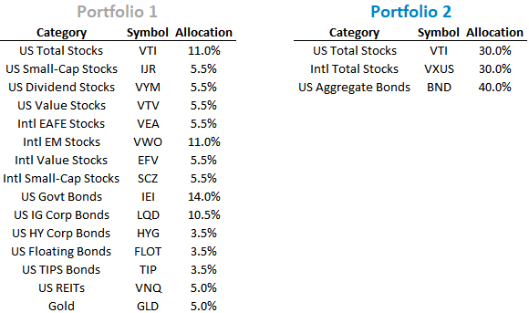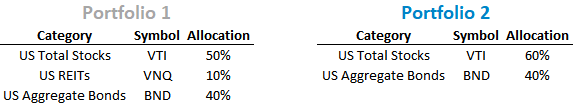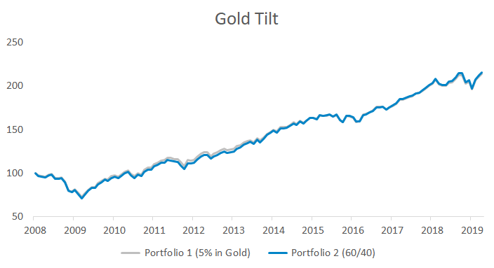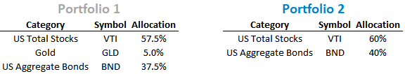 This post examines the total portfolio impact of small allocations. All hypothetical portfolios shown are annually rebalanced and include reinvested dividends and interest. I used Portfolio Visualizer for all of the below analysis.