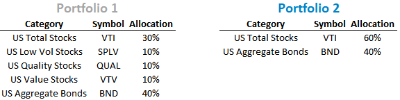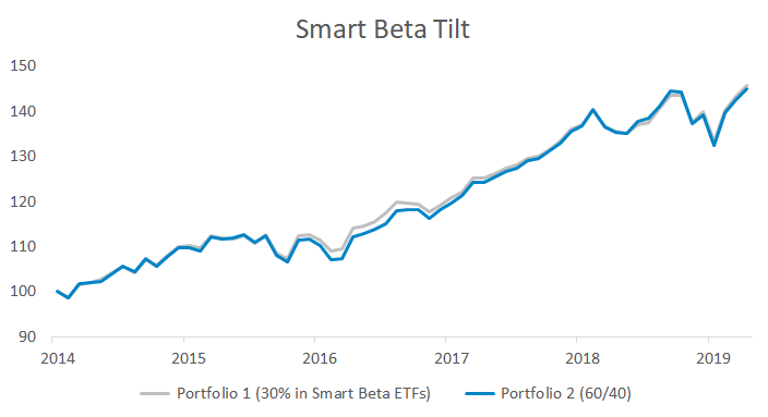 Since smart beta funds are typically implemented as satellite allocations, investors should care if these small tilts actually impact performance. The table and graph below show two portfolios. One has half of its 60% stock exposure in smart beta funds. The other is a 60/40 portfolio with 60% in Vanguard’s total market-cap stock fund and 40% in Vanguard’s aggregate bond fund.