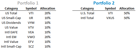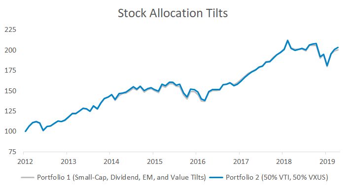 Slice-and-dice portfolios try to outperform the broad market by overweighting market segments that have historically outperformed. Let’s say an investor decided to overweight small-cap, dividend, and value stocks. Has this made a difference compared to a 50/50 split between Vanguard’s total market-cap domestic and international funds?