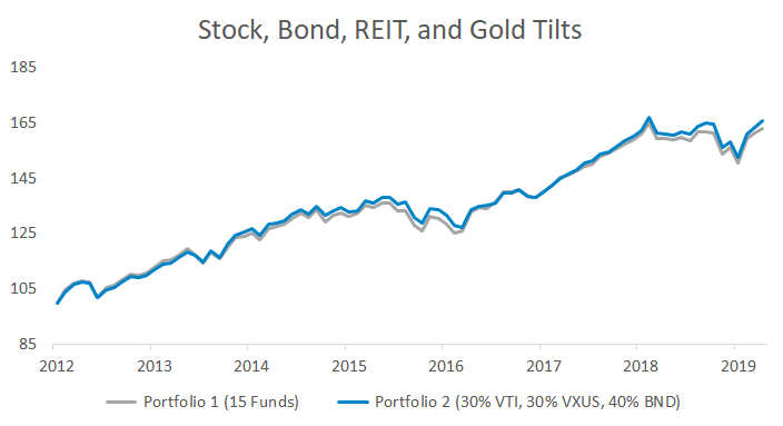 This final scenario splits stock, bond, REIT, and gold exposure across fifteen funds. A lot is going on under the hood – but have the returns been different than a simpler (and lower fee) solution?